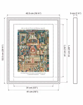 Religious figures are arranged within a carefully ordered architectural framework, emphasizing symmetry, repetition, and internal balance. Beneath the image appears a statement in French asserting that the maker was not the author of the work and that unseen forces guided its architectural structure.