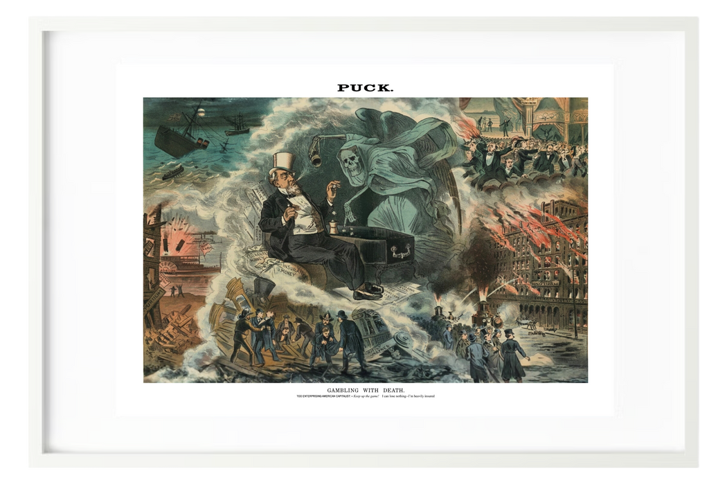 “Gambling With Death” stands as one of Bernhard Gillam’s most evocative political cartoons—an unflinching snapshot of life in the late 19th century. First published in Puck magazine and now preserved in the Library of Congress, the illustration shows a complacent capitalist literally playing cards with Death, surrounded by scenes of industrial disaster, fire, and maritime tragedy.