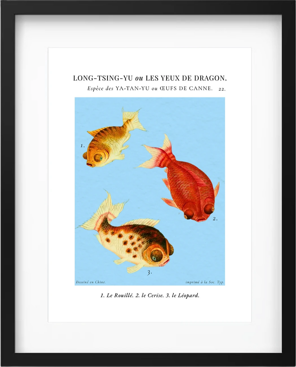 Long-Tsing-Yu: Les Yeux de Dragon – Étude des Variétés Ornées, dated to the 1800s, is a visual study of ornamental fish varieties presented through careful illustration and classification.
