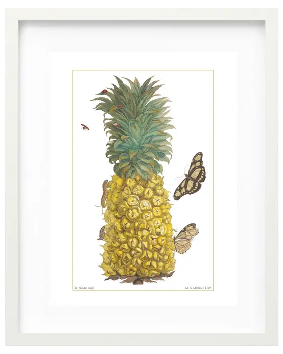 Rather than presenting the pineapple as novelty or ornament, Merian renders it through disciplined observation—its structure, surface, and surrounding life examined with clarity and restraint. Working without institutional backing in a period when scientific authority was rarely afforded to women, Merian built her practice through patience, precision, and sustained looking. This composition reflects that approach. Abundance is held in balance by control, and visual richness is shaped by method rather than spectacle.